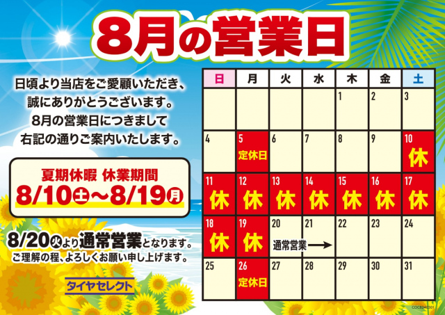 8月になりました。 今月は、お盆休みにお出掛けになる方も多いいのでは? 夏の風物詩、夏祭り、花火大会も楽しみですね♪♪ 先月、13日から開催しております! 全力セール 残り9日となりました。 お車でお出掛けにな...