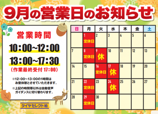 いつもホームページをご利用いただき有難うございます♪ 8月もたくさんのご来店有難うございました♬ 9月の営業日はカレンダー画像の通りとなります。 まだ暑い日が続きそうですが・・・ 9月もたくさんのご来店をお待ち...