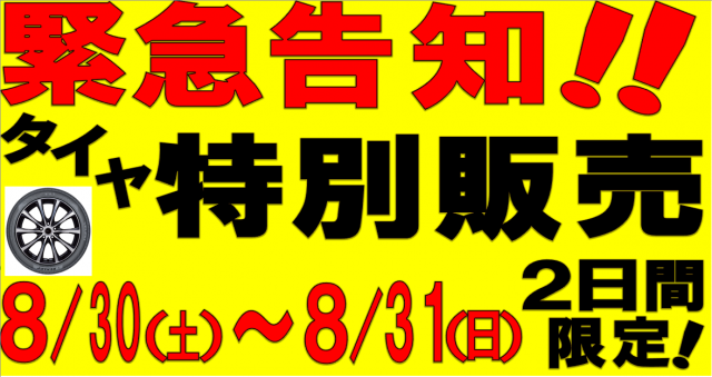 いつもホームページをご利用いただきありがとうございます♬ 8/30、31の2日間限定でタイヤ特売会開催いたします!! まだまだ残暑が続く季節です! この機会に是非当店をご利用ください! まだ枠に空きがございます! ...