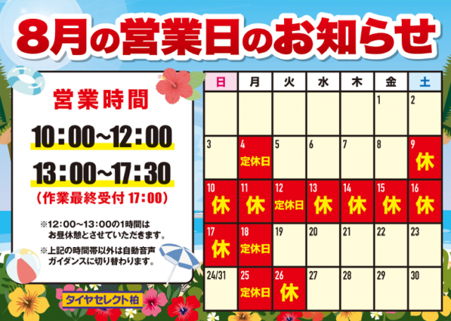 いつもホームページをご利用頂きありがとうございます♪ 8月9日(土)~8月18日(月)の期間、当店は夏季休業となります。 8月19(火)から通常どおり営業いたします。 お客様にはご不便をお掛け致しますがご理解賜りますよう...