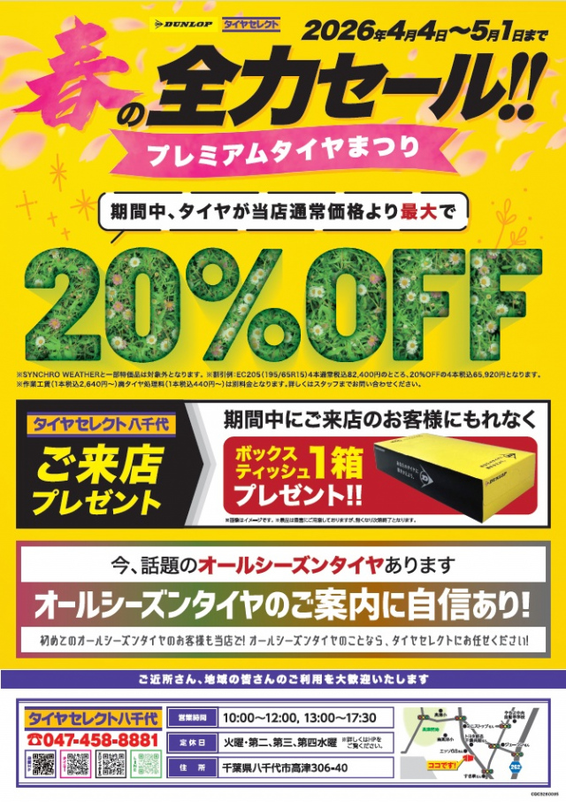 お世話になっております タイヤセレクト八千代です 2026年4月4日(土)~2026年5月1日(金)まで 春の全力セールを開催致します 期間中、当店でのタイヤ購入価格が通常より最大20%OFF!! さらに期間中のご来店...