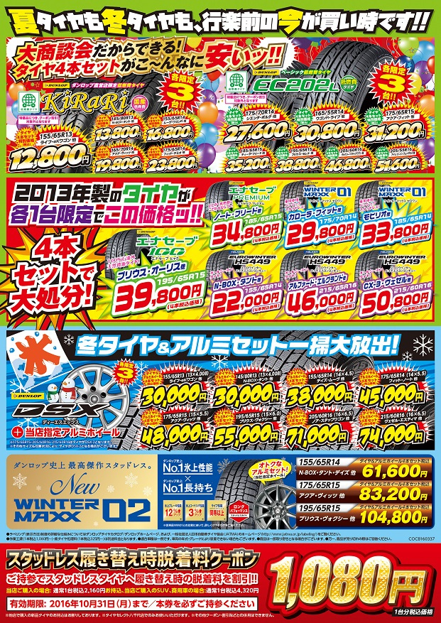 セール期間中にタイヤ4本ご購入で店頭表示価格より10,000円OFFに出来る特別優待クーポンをご利用出来ます!