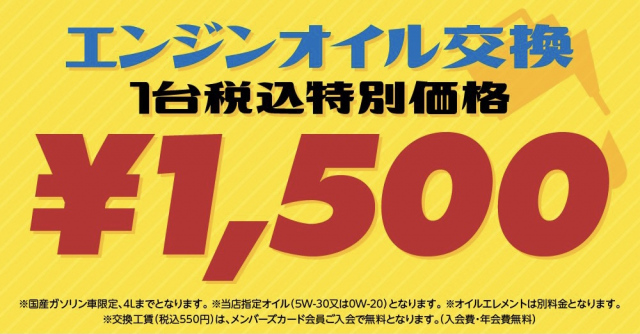 4.エンジンオイル交換1台特別価格¥1500(税込)【4Lまで、当店指定オイル5w-30、0w-20】