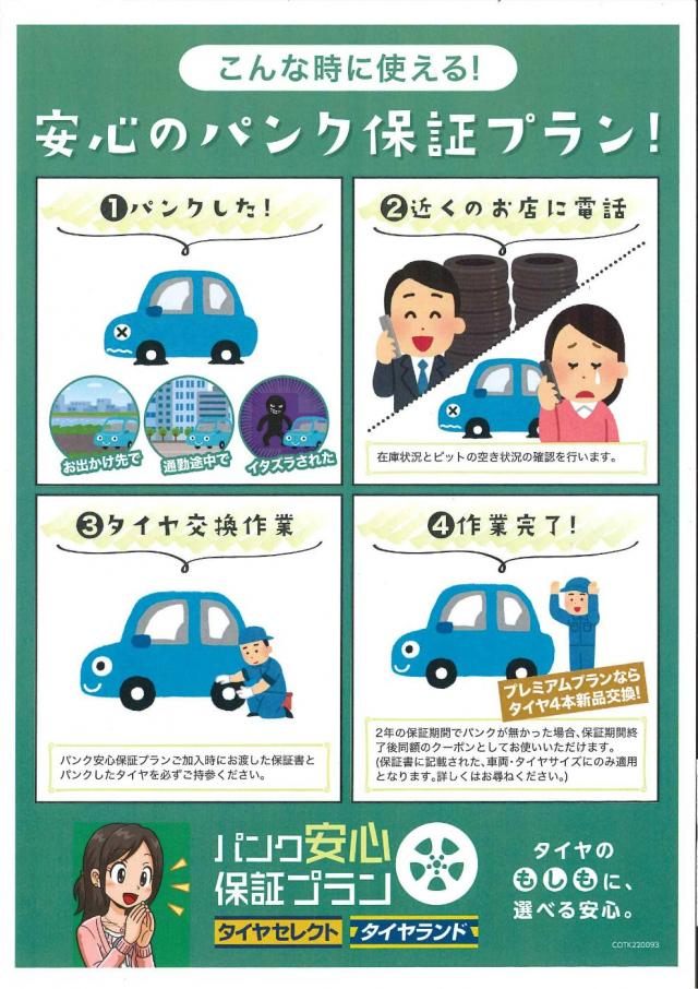 当店では、新品タイヤご購入時に入れる【パンク保証プラン】があります。