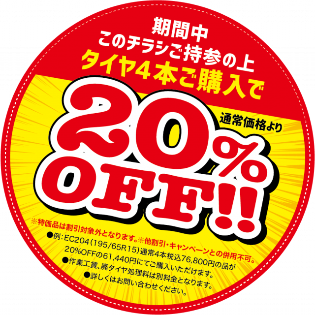 期間中、セールチラシを見たとお伝え頂くとタイヤ4本ご購入で20%OFF。