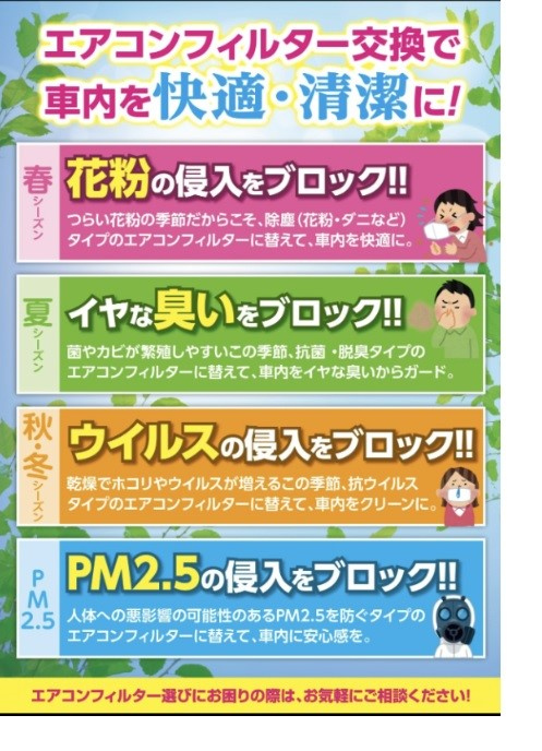 定期的な交換・点検でクリーンな車内空間にしてくれます。
