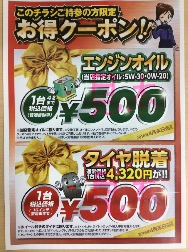 さらに、イオンモール八千代緑が丘から車で約7分の所にあるタイヤセレクト八千代にお越しいただけるお客様には、以下の特別プレミアムクーポンを差し上げます。