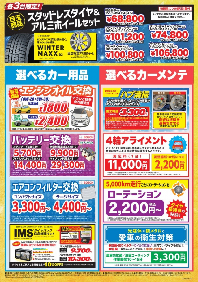 目玉商品、スタッドレスタイヤ&アルミホイールセットをはじめ