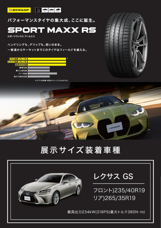 SPORT MAXX RS 展示中 ダンロップのスポーツマックスRS 愛車のパフォーマンスを引き出す ハイグリップ・ハンドリング性能 タイヤサイズ235/40R19を展示中! 装着車種は一例なのでお気軽にご相談下さい 2025.03.23