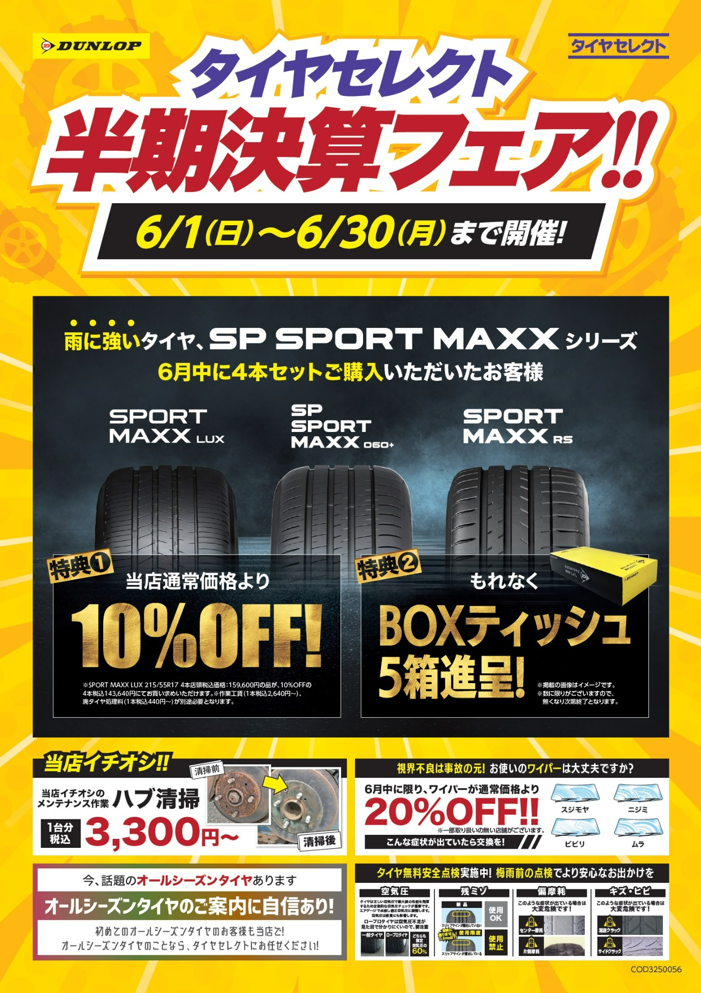 半期決算フェア開催 6月は半期決算フェアのご案内です 梅雨時期にお出掛けのご予定のお客様 雨に強いスポーツマックスシリーズはいかがでしょうか? 高速でも安心感を持って走行出来ます お見積り・ご相談は無料なのでお気軽にご来店下さい 2025.05.31