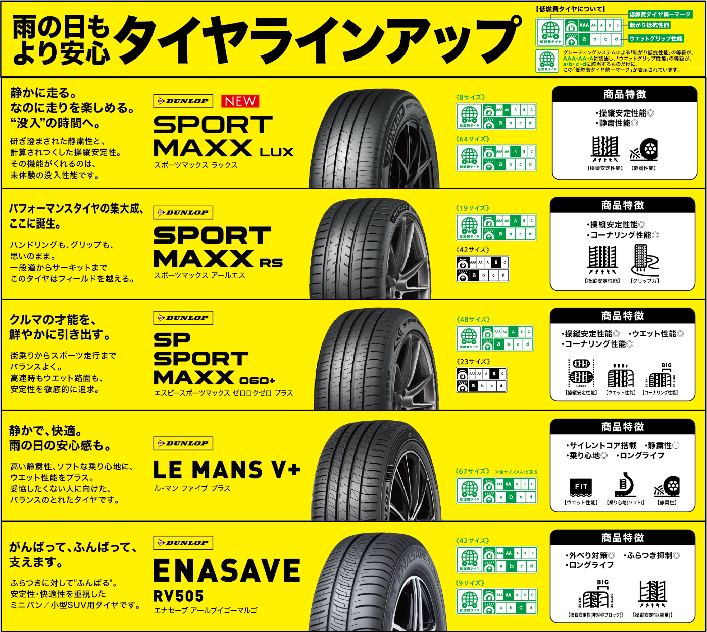 ダンロップの雨にも強いタイヤラインナップのご案内です