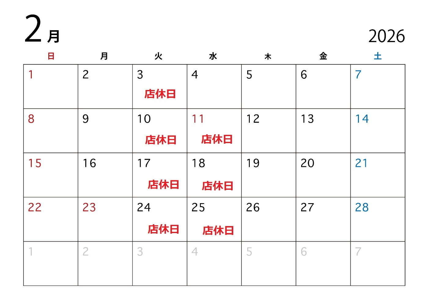 2026年2月の営業案内になります