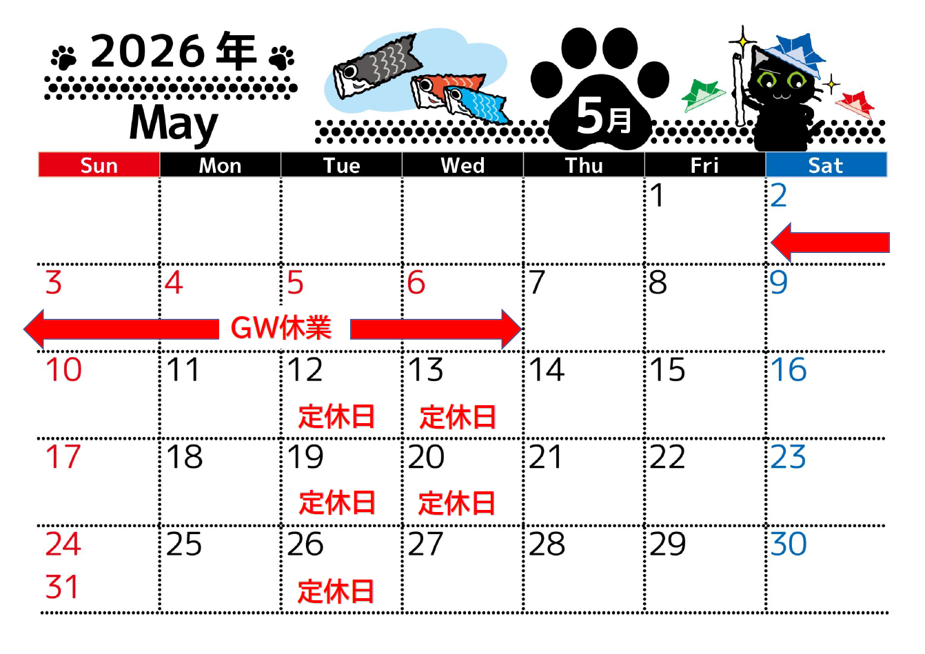 5月2日㊏ ~ 5月6日㊌ は休業となります。