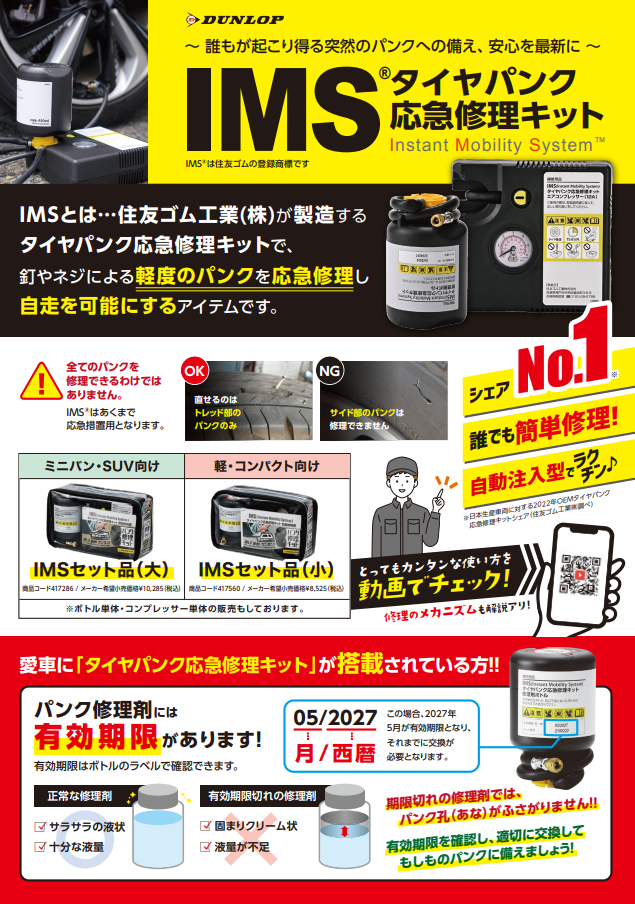 最近では、スペアタイヤではなくIMSが装備されてる車も多くなってきました。
