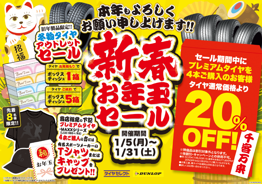 ・タイヤの見積りでボックスティッシュ1箱、購入で5箱プレゼント!