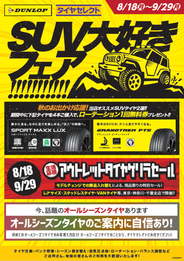 こんにちは! タイヤセレクトしんよこはま店です。 いつも当店をご利用頂きましてありがとうございます。 夏季休業明けの18日より 【SUV大好きフェア】を開催致します。 【開催期間】2025年8月18日(月)~9月...