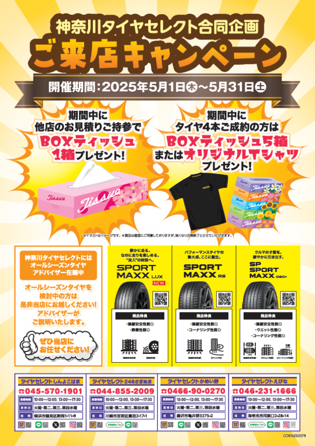 こんにちは! いつもお世話になっております。 タイヤセレクトしんよこはま店です。 5月のキャンペーンのお知らせです! 開催期間:5/1(木) ~ 5/31(土) ①:期間中に他店のお見積りご持参でBOXティッシュ...