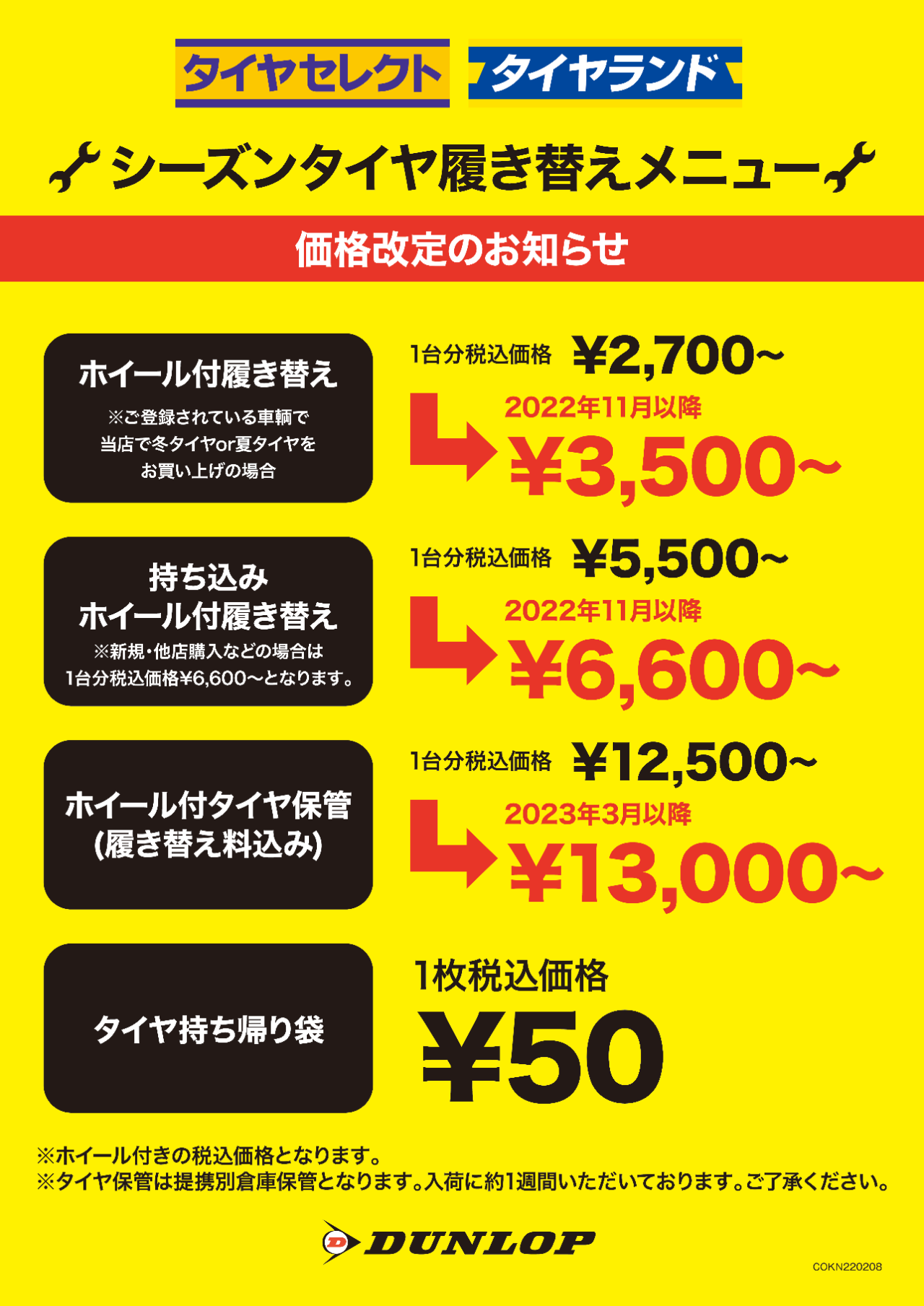 11月からスタッドレスタイヤの履き替え工賃を改定いたします。