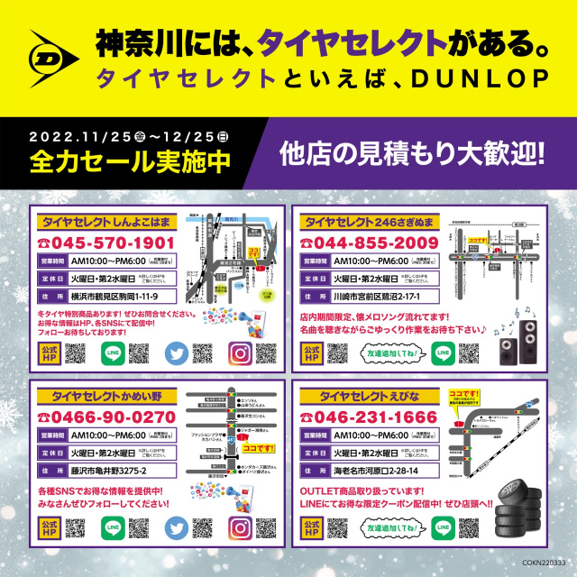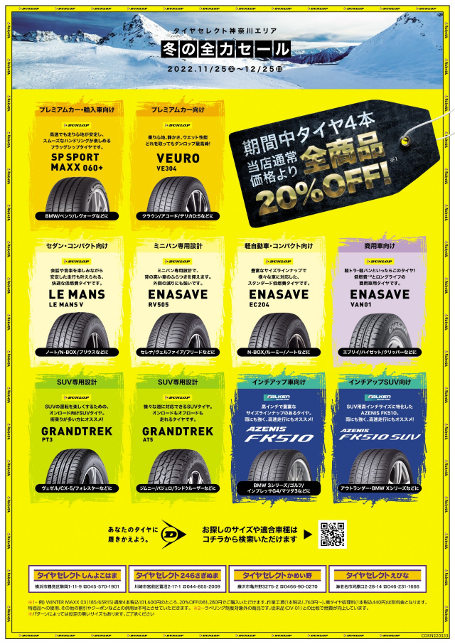 11/25~12/25の期間、神奈川タイヤセレクト4店舗で冬タイヤ夏タイヤ関わらず、