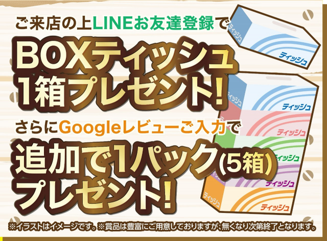 ②ご来店時にLINE登録をご提示でBOXティッシュをひと箱プレゼント!