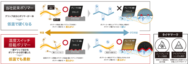 【温度スイッチ】▶ゴムを構成する成分のポリマーと従来のタイヤに含まれているグリップ成分との結びつきを減らし、ポリマーが自由に動ける部分を増やすことでタイヤの柔らかさを低い温度でもタイヤが硬くなりにくくなりました✨