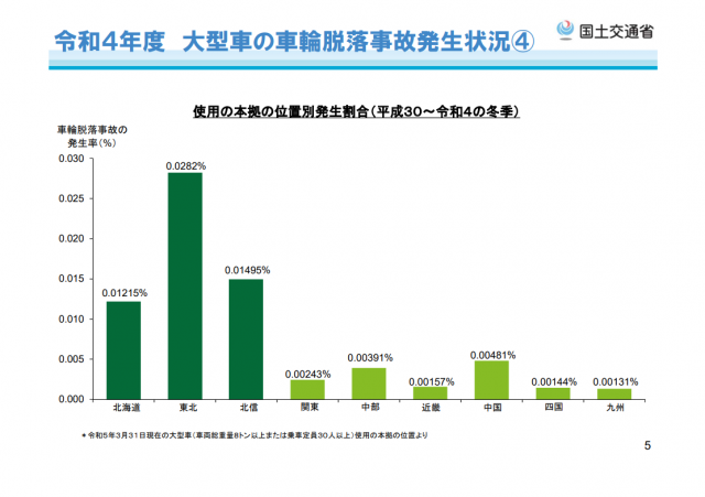 上記グラフは「令和4年度 大型車の車両脱輪事故発生状況」(令和4年度/国土交通省調べ)を地域別に件数を振り分けたものです。