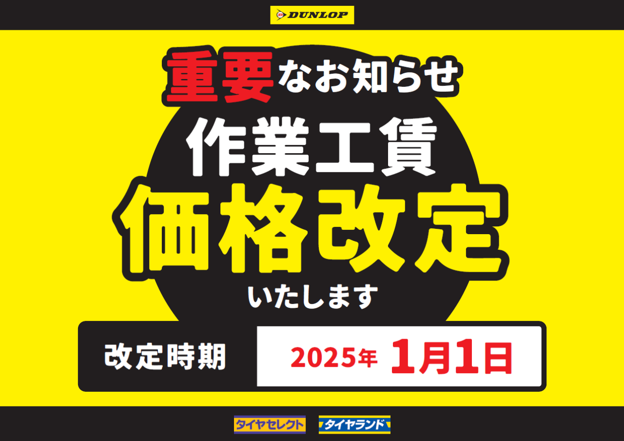 タイヤセレクト246さぎぬま店では、2025年1月より一部工賃を改訂いたしました