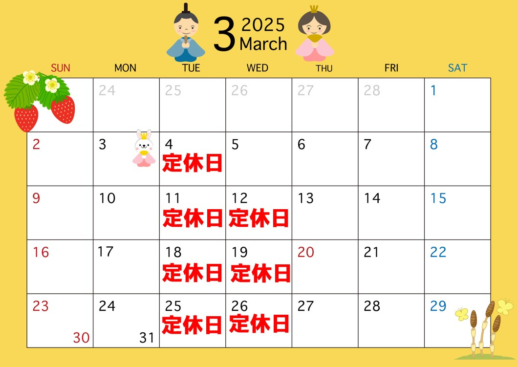 以上が3月の定休日となります