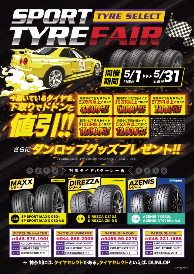 神奈川タイヤセレクト合同企画 「SPORT TYRE FAIR」開催中です!! 期間:5/1~5/31 キャンペーン内容:対象商品を購入いただいたお客様に今履いているタイヤを下取りで、 最大12,000円値引き!...