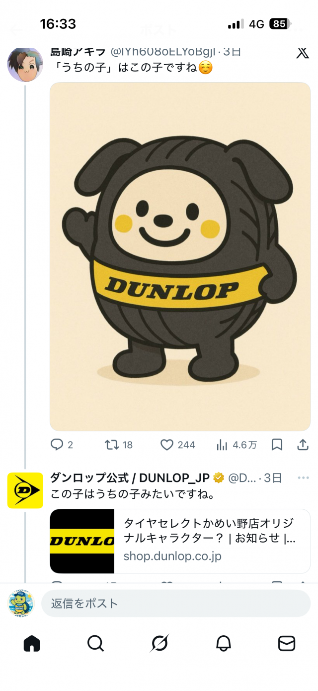 ダンロップタイヤ公式Xにて、、、、! タイヤセレクトかめい野店です! 先日個人的に面白いと思った投稿を見つけました(笑)( *´艸`) かめい野店で勝手に作ったキャラクターが公式にも認められ?ました(^○^) うちの子認定されました(笑) ありがとうございます\(^o^)/ 2026.03.22