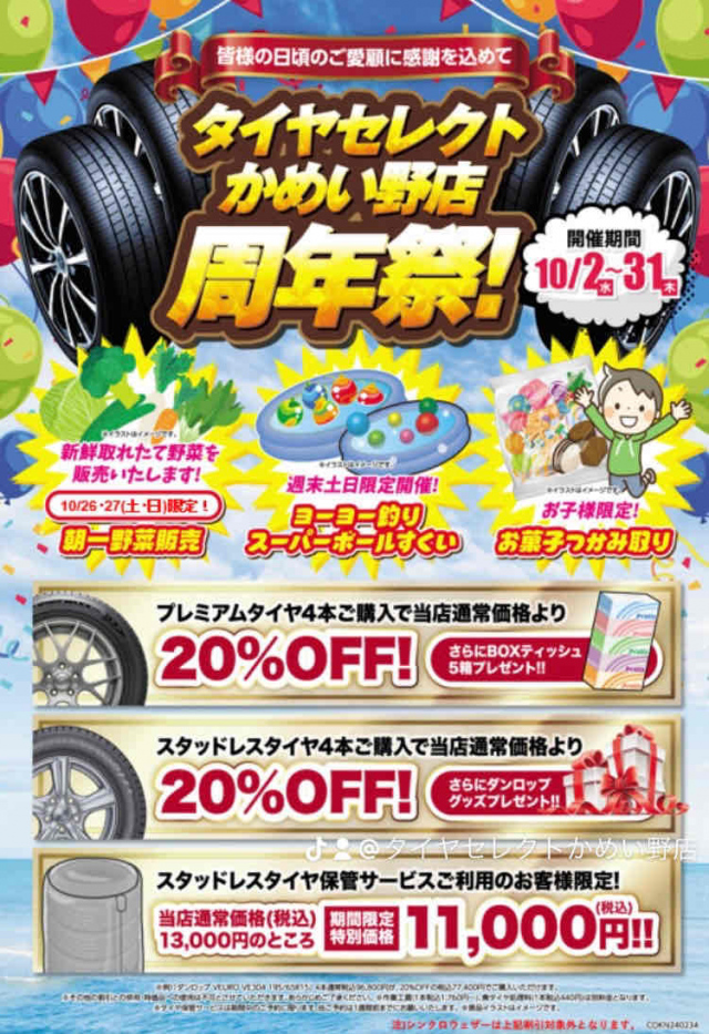 ミニイベント!周年祭\(^o^)/ タイヤセレクトかめい野店です! 周年祭週末イベント!! お子様限定 ・お菓子のつかみ取り ・スーパーボールすくい ・ヨーヨー釣り あいにくの天気ですが遊びにきてくださいね~\(^o^)/ 2024.10.05