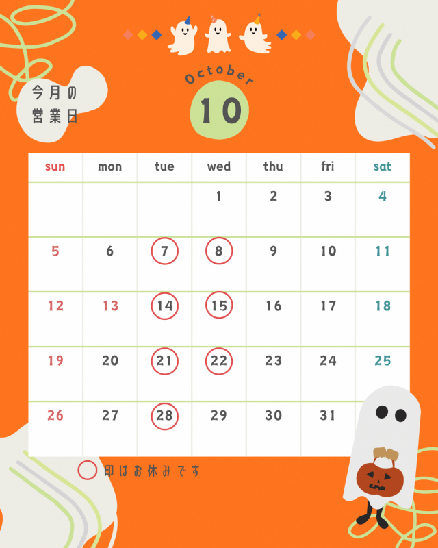 いつも当店のHPをご覧いただき 有難うございます! 10月の定休日のご案内です! 7日(火)・8日(水)・14日(火)・15日(水) 21日(火)・22日(水)・28日(火) 今月...