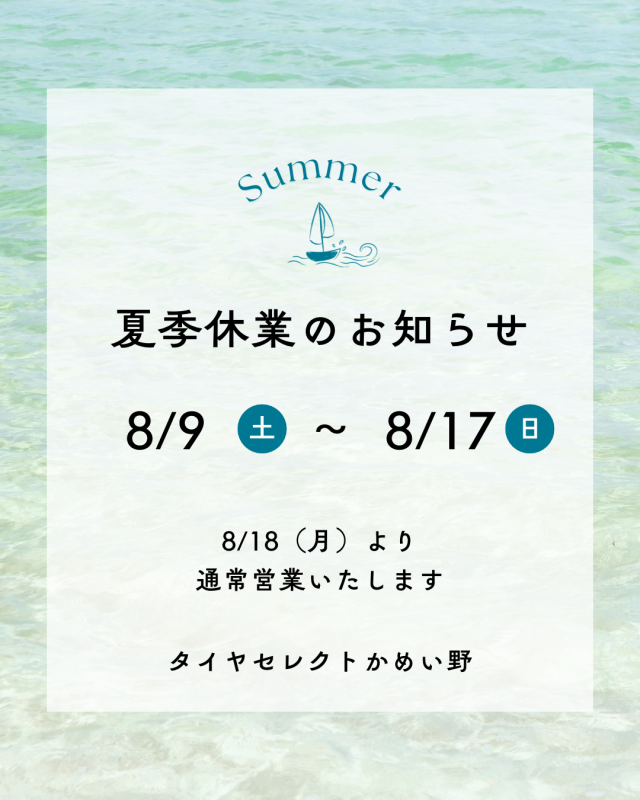 タイヤセレクトかめい野店です!\(^o^)/ 夏季休業のお知らせです! 8/9(土)~8/17(日)までお休みになります。 お客様にはご不便をおかけしますが ご理解のほどよろしくお願いいたします。 &nbs...