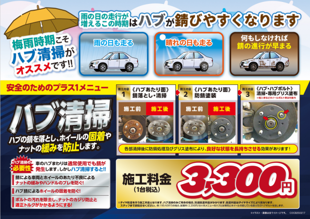 タイヤセレクトかめい野店です(`・ω・´) 梅雨の時期こそハブ清掃!!! 雨の日の走行が増えるこの時期はハブが錆びやすくなります。 そこで!!! 当店ではハブ清掃をオススメします! ハブの錆を落とし、ホイ-ルの...