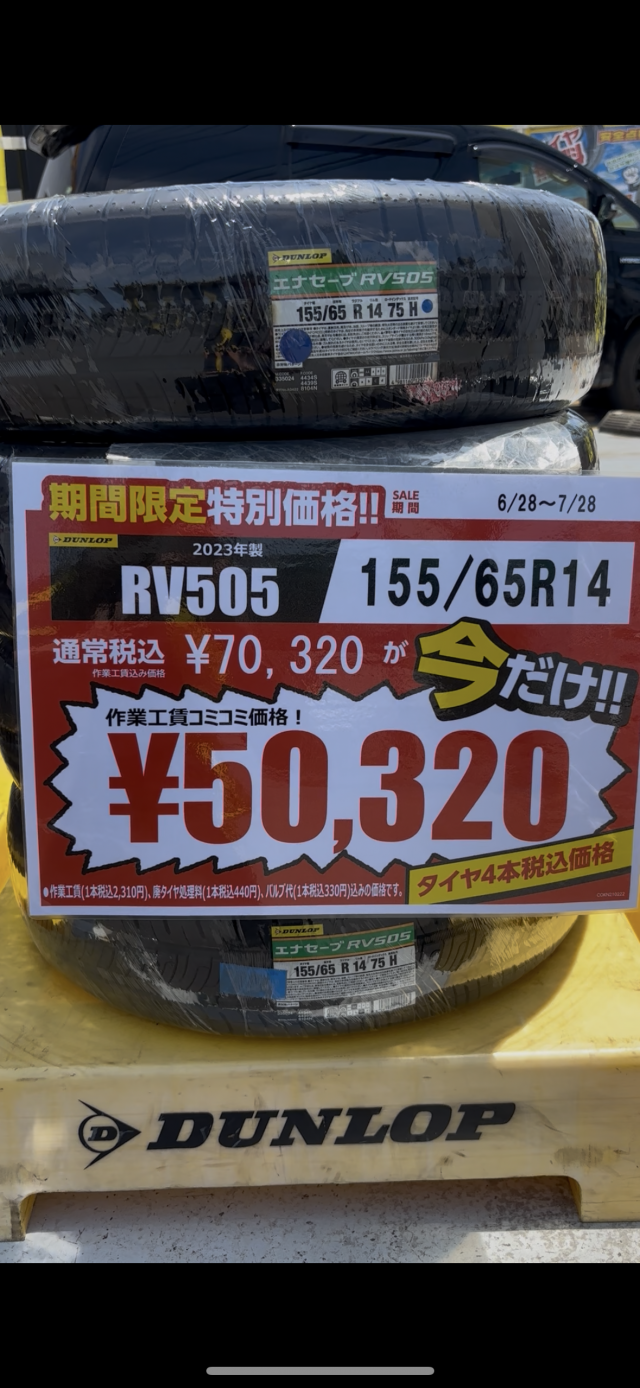 タイヤセレクトかめい野店です(`・ω・´) 本日軽自動車のアウトレットタイヤ入荷しました! サイズ:155/65R14 メーカー:ダンロップ 種類:①RV505(あーるぶいごーまるご) ②LM5+(るまんふぁいぶ ぷらす) &...