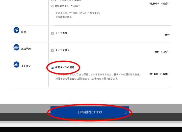 メニュー一番したの保管タイヤ脱着をお選びください。