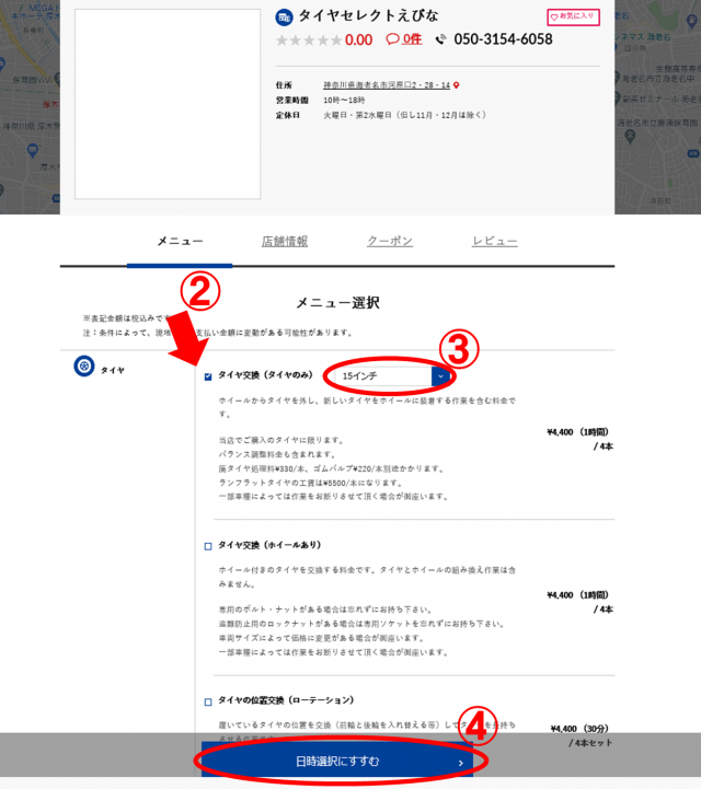 ③タイヤ交換の場合、交換予定のインチを選択ください