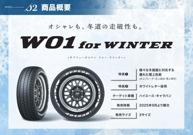 新商品は3月に発売し好評を得ている夏用タイヤ「W01」※2のスタッドレスタイヤで、「W01」として1年中ワンボックスカーでのドレスアップが可能になります。