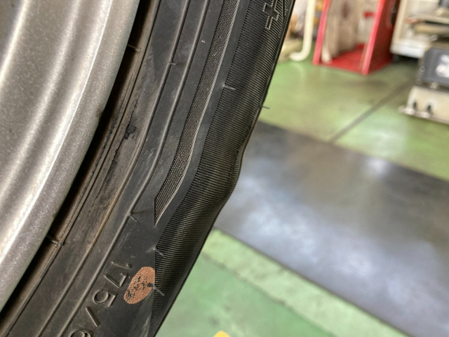 縁石などに強くタイヤをぶつけると起きるもので、タイヤの中にある材料=コードが切れ、ぶつけた部分がコブのように膨張・膨らむ現象のことを言います!
