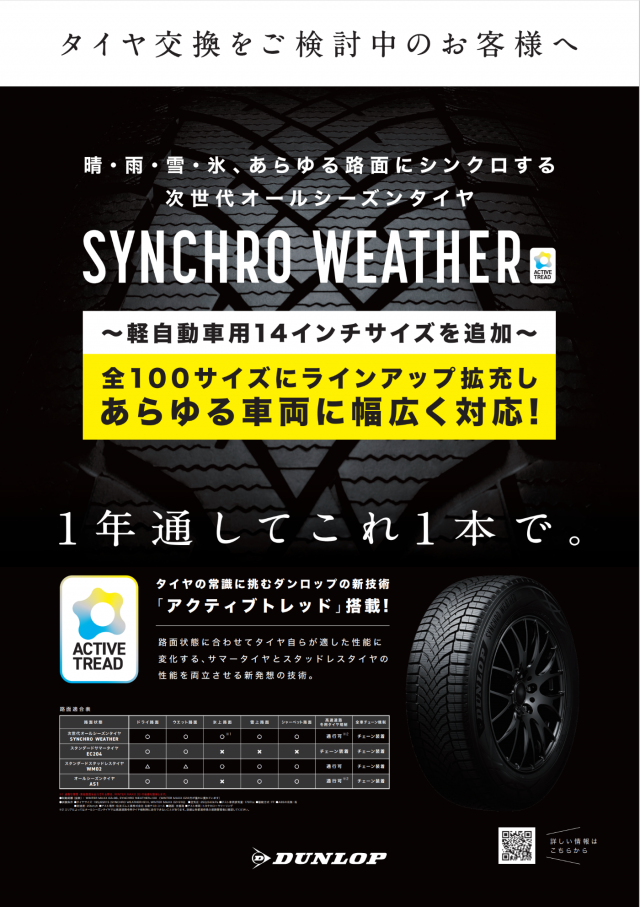 今年も11月・12月は履き替えの混雑が予想されます。 早め早めに冬タイヤへの履き替えお願いします(;^_^A 履き替えいらずの! シンクロウエザー大好評(#^.^#) 155/65R14も予約受付中(^_-)-☆