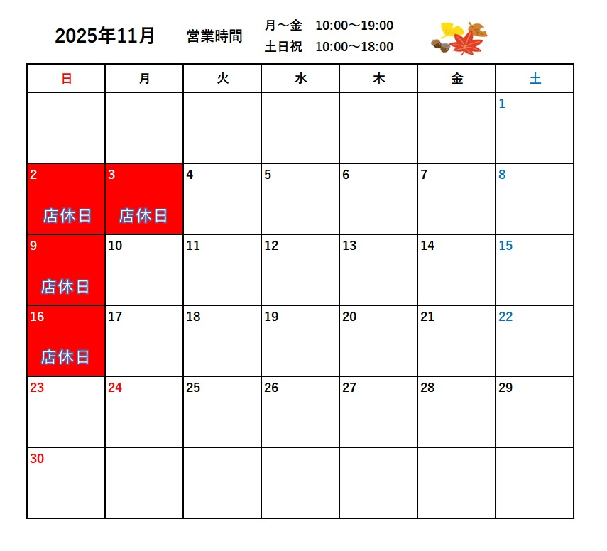 11月の定休日・営業時間は