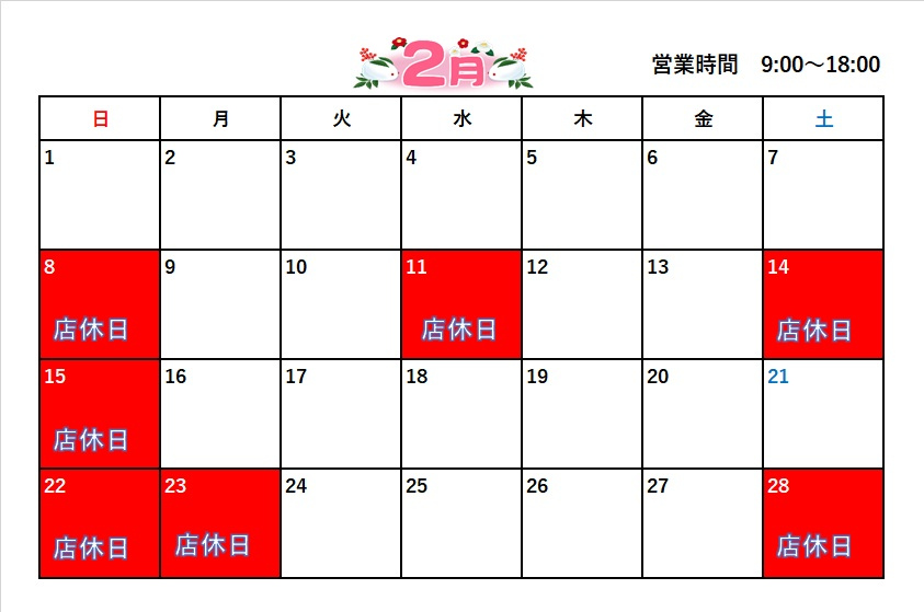 2月の定休日・営業時間は
