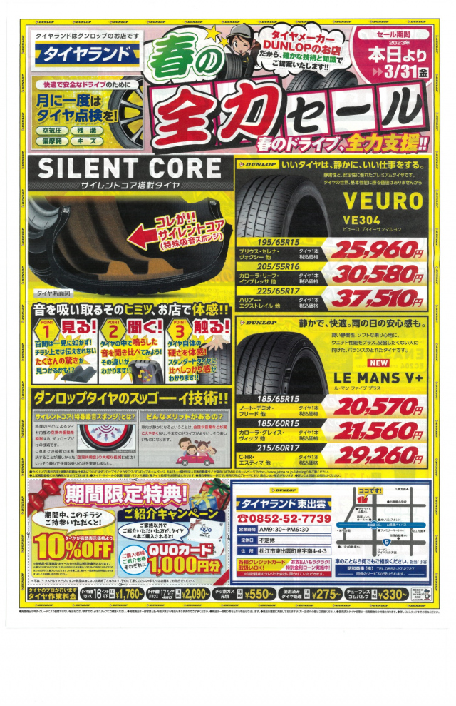 春の全力セール開催中!! こんにちはタイヤランド東出雲です。 愛車の夏タイヤは大丈夫ですか? タイヤ購入はもちろん、点検・相談にお答えします! 当店では全力セール開催中です(*^_^*) 2023.03.04