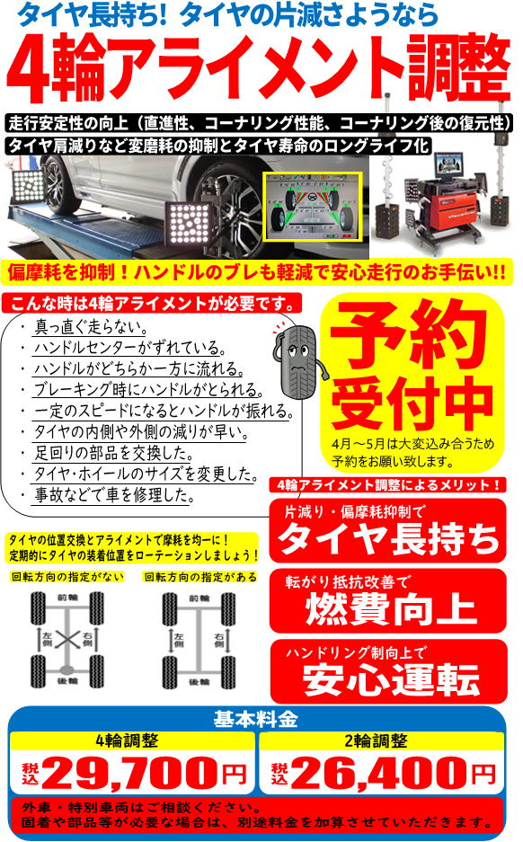タイヤの摩耗抑制や、燃費向上にもつながりますよ!定期的な点検をオススメします!