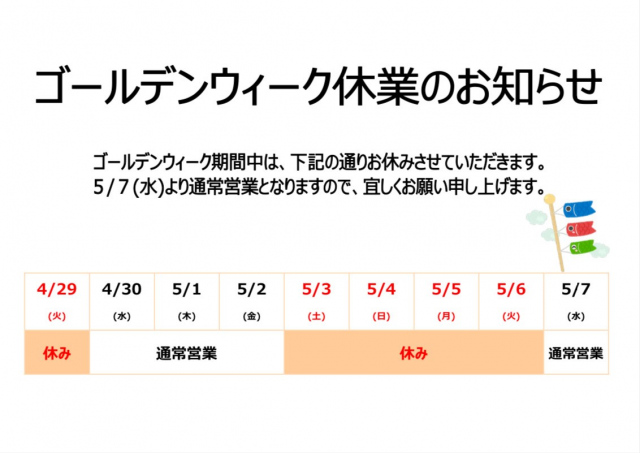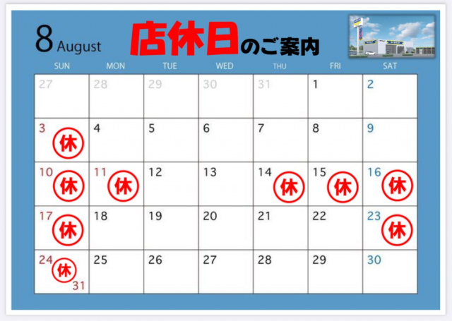8月11日(日)~8月15日(木)の5日間、お休みをいただき16日(金)より通常営業となります。 ご迷惑をおかけいたしますが、ご理解のほど宜しくお願いいたします。