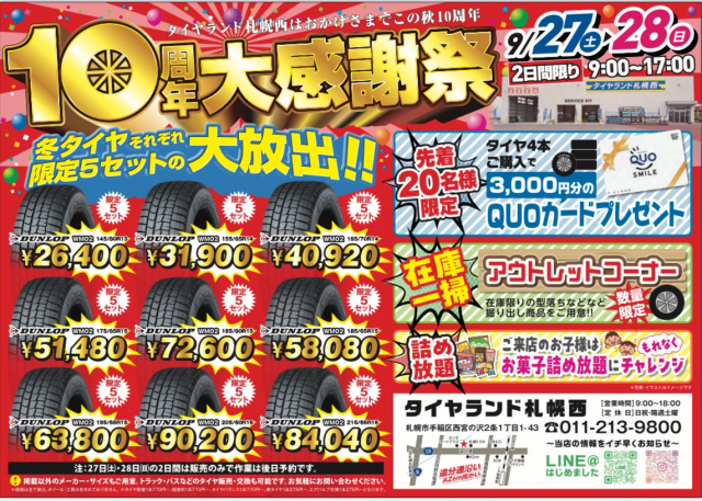 タイヤランド札幌西は、おかげさまで10周年を迎えることができました! これまでのご愛顧に感謝を込めて、9月27日(土)-9月28日(日)の2日間で10周年大感謝祭を開催いたします♪ イベントの2日間は、9:00~17:00のお時間...