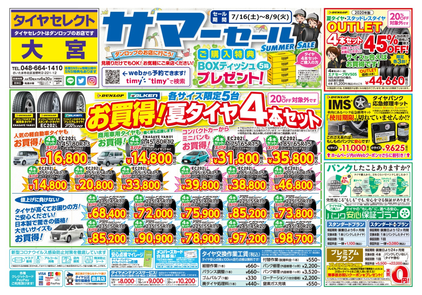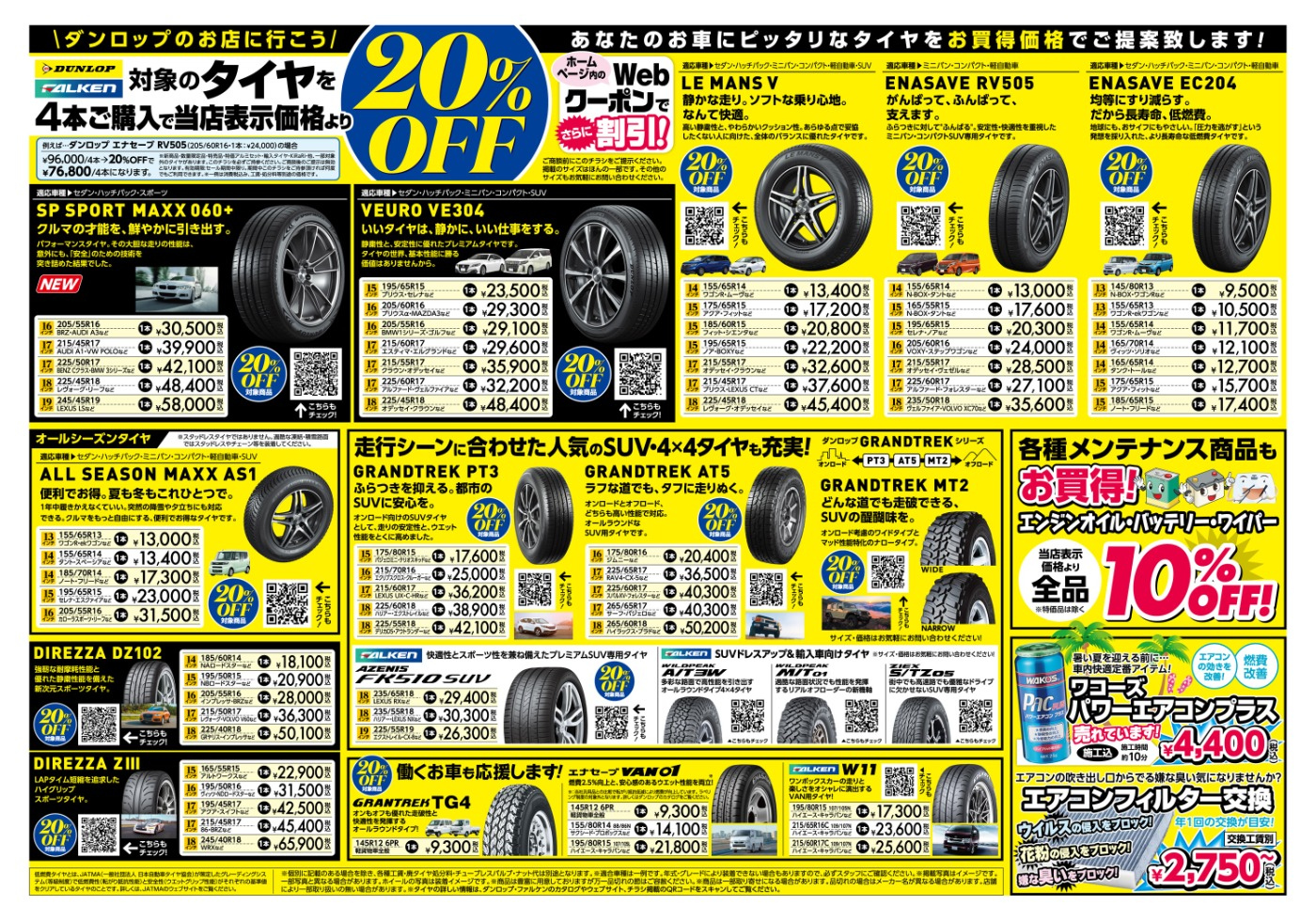 お得なサマーセール開催! お盆中にお出かけする方必見! 期間中にタイヤをご購入頂くと お得なセール開催\(^o^)/ さらに! WEBクーポンを使って頂くと もっとお得に(≧▽≦) この機会をお見逃しなく!! ※開催期間 7/16(土)~8/9(火)まで! 2022.07.08