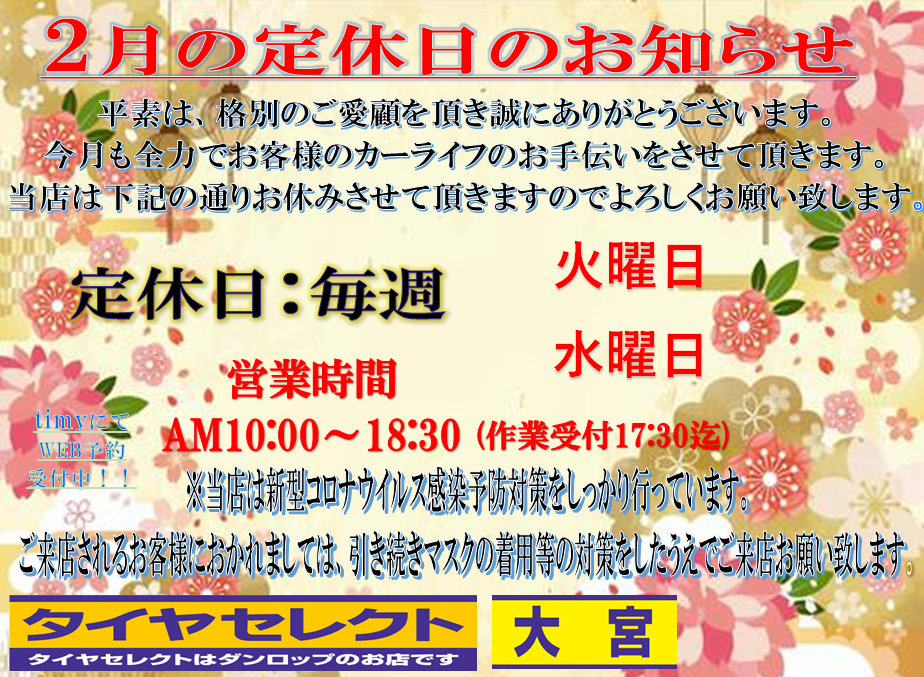 2月のお休みのお知らせ! いつも当店をご利用いただきまして 誠にありがとうございます。(*´▽`*) 2月のお休みは次の通りです! 28日を除く毎週火曜日 毎週水曜日となります<(_ _*)> お間違いの無い様ご注意下さい(;^ω^) 2023.01.27