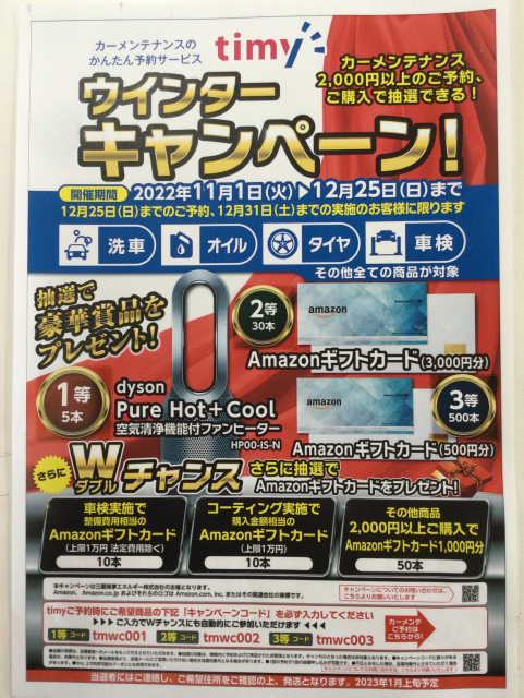 いま! オンライン予約サービス timyをご利用頂くと 抽選で豪華賞品が当たる チャンス! 応募方法は予約画面で キャンペーンコードを入れるだけ! 1等 dyson Pure HOT+Cool 空気清浄機能付きファンヒーター キ...