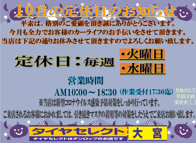 10月の定休日のお知らせです! 毎週火曜日・水曜日が定休日となりますm(_ _)m ご迷惑をお掛け致しますが、 よろしくお願い致します(*'▽') スタッドレスタイヤ早期ご予約受付中です! お...